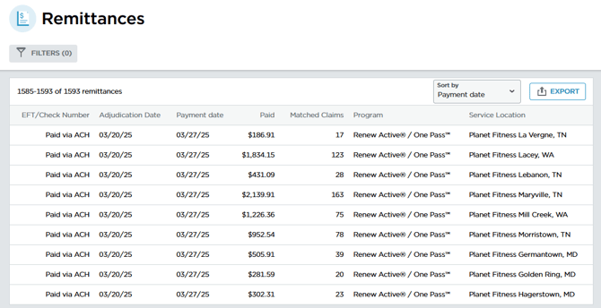 The "Remits" tab displays the list of the payments and/or rejections from the payer. You can use the "Sort By" and "Filters" buttons to change the list display to suit your needs.