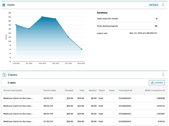Welld's Visit and Remit screens display the detailed data on check-ins sent to the payer, and how you were paid.